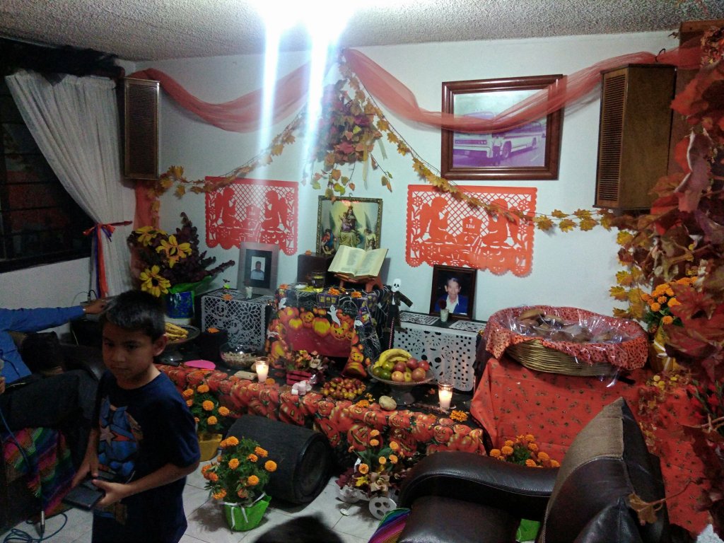 Un altar con llamas vivas entre pétalos y velas, el pan de pueblo, los manjares insaboros, el agua seca del desierto, la fruta húmeda de árboles muertos, los dulces, las cruces de madera y cal, un cirio que baila al vapor del viento, las fotos de ellos, de sus cuerpos vivos entre tanto brillo y tanto seco.